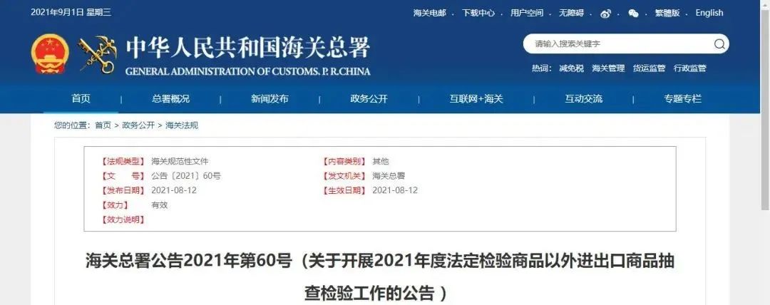 8月12日,海關(guān)總署發(fā)布2021年第60號公告,決定對2021年法定檢驗(yàn)商品以外的部分進(jìn)出口商品實(shí)施抽查檢驗(yàn),抽查檢驗(yàn)的商品范圍涉及20類進(jìn)出口商品,其中進(jìn)口商品13類,出口商品7類。