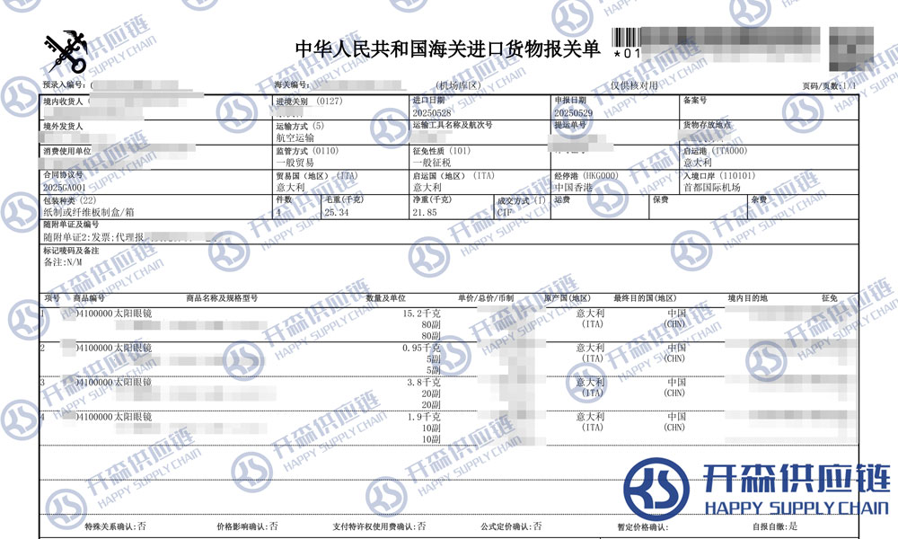上述就是北京機(jī)場太陽眼鏡進(jìn)口報(bào)關(guān)代理服務(wù)【清關(guān)案例】的全部內(nèi)容,希望能對您有所幫助,如有進(jìn)口報(bào)關(guān),進(jìn)口報(bào)關(guān)代理公司,進(jìn)口報(bào)關(guān)代理上任何疑問及問題可隨時(shí)在線聯(lián)系我們或撥打 18002611553,開森供應(yīng)鏈擁有豐富的進(jìn)口報(bào)關(guān),進(jìn)口報(bào)關(guān)代理公司,進(jìn)口報(bào)關(guān)代理操作經(jīng)驗(yàn)及案例,10余年進(jìn)口經(jīng)驗(yàn)為您所用,各類進(jìn)口疑難都能為您一一解答及協(xié)助快速處理解決!